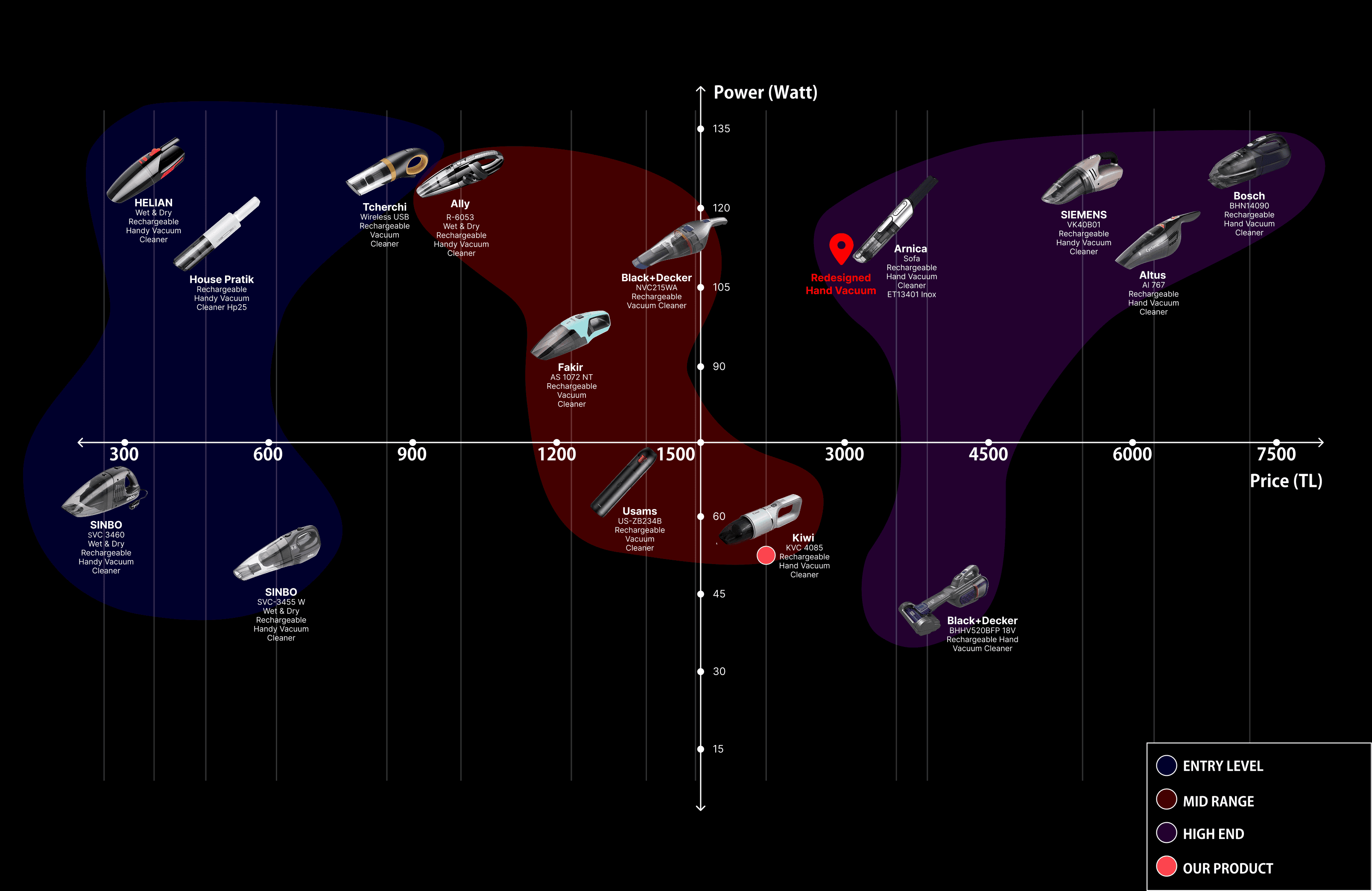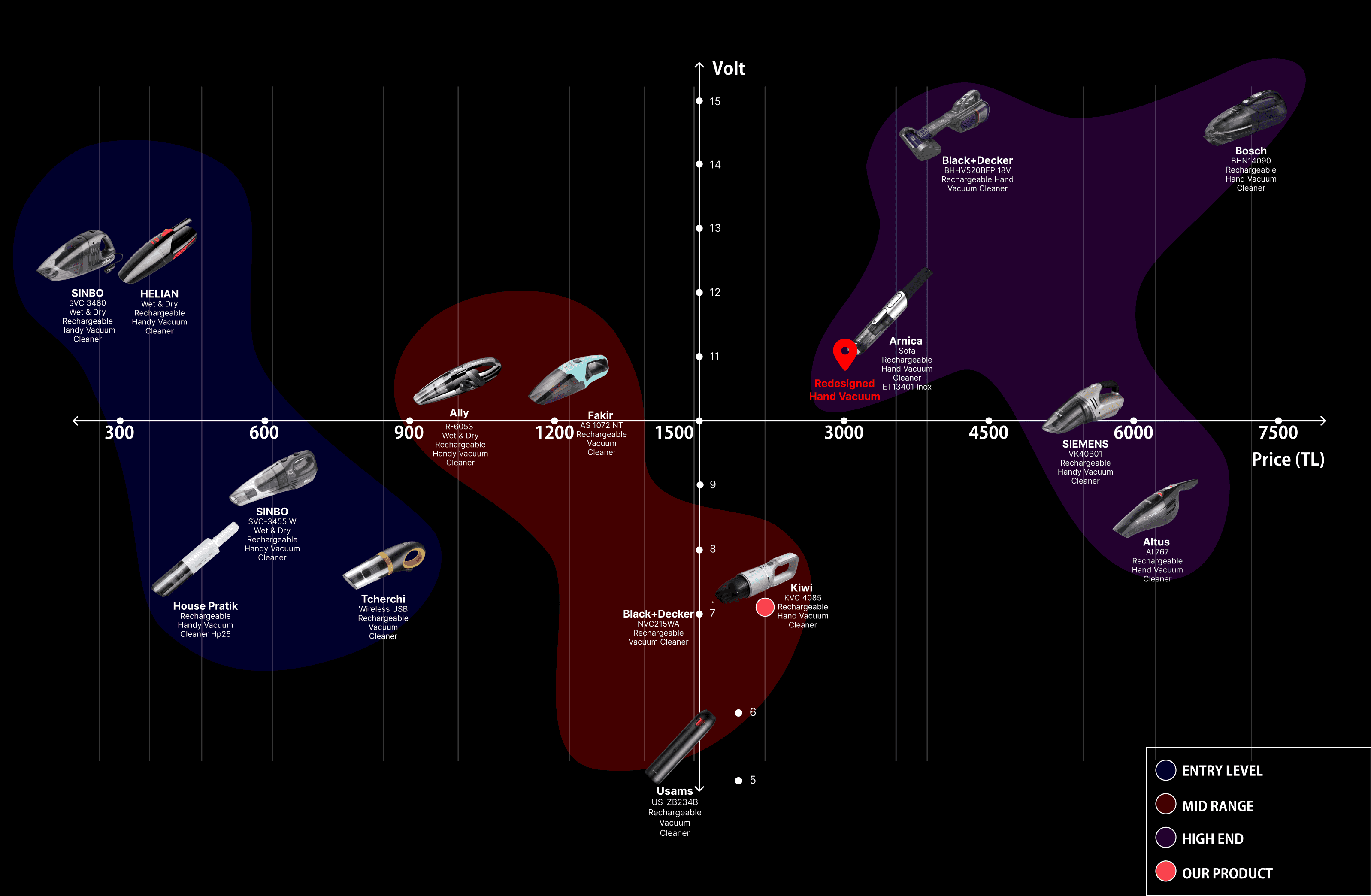 We analyzed the market based on price–performance relationships by comparing price/voltage and price/watt ratios. This allowed us to understand how existing products are positioned in terms of power efficiency and cost, and helped us identify gaps and opportunities for improvement.